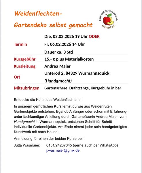 In unserem gemütlichen Kurs lernst du wie aus Weidenruten Gartenobjekte entstehen. Egal ob Anfänger oder schon mit Erfahrung-unter fachkundiger Anleitung durch Gartenbäuerin Andrea Maier. vom Handgmocht in Wurmannsquick, entstehen Schritt für Schritt individuelle Gartenobjekte. Am Ende nimmt jeder sein handgefertigtes Kunstwerk mit nach Hause.
